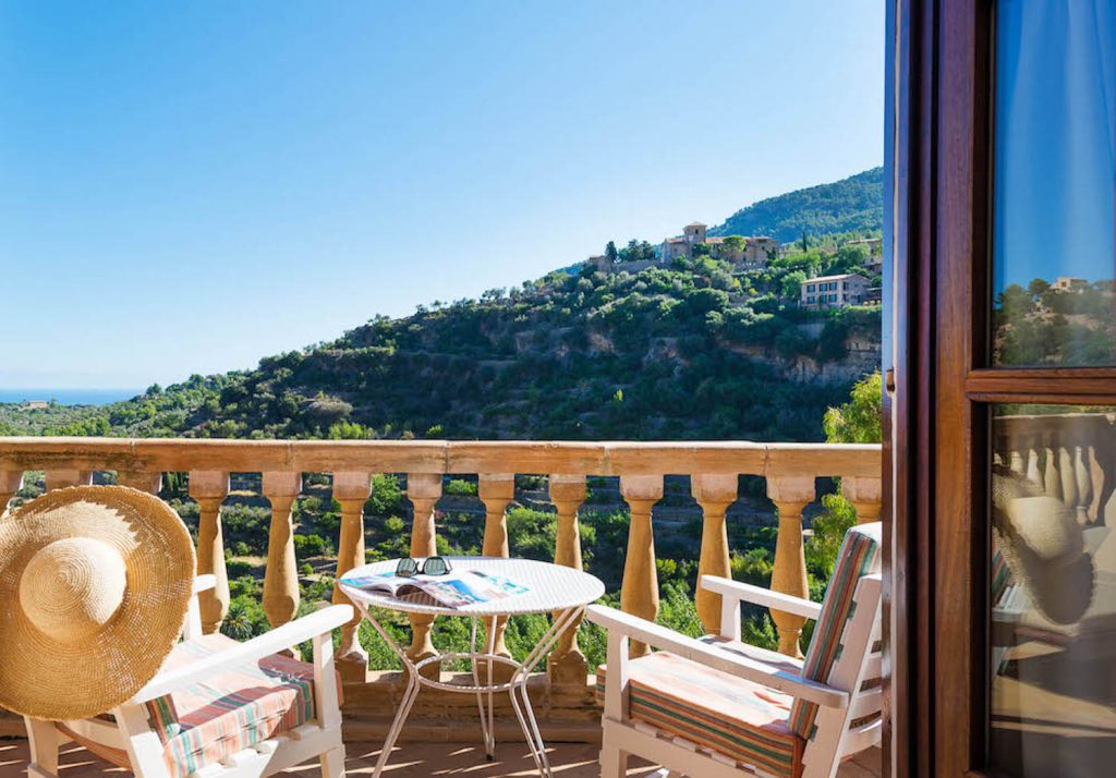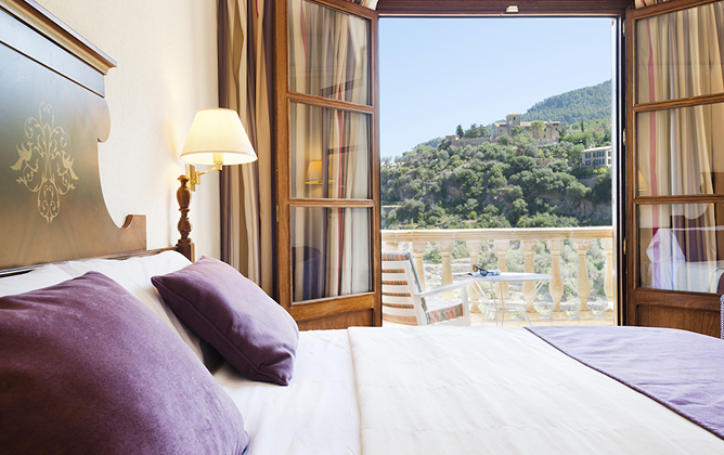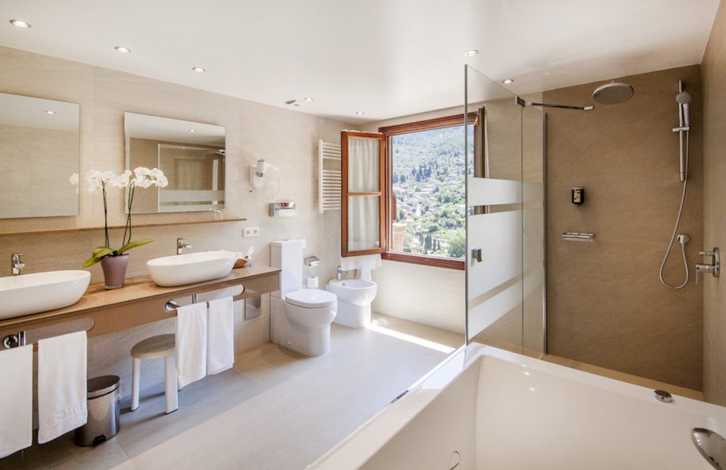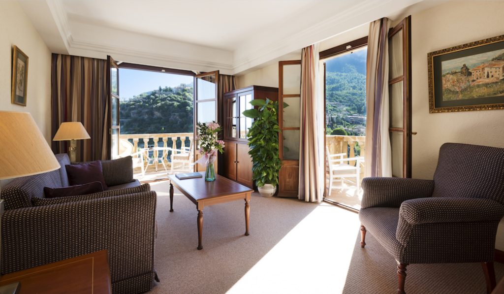 Ubicada en la quinta planta del edificio principal, la Suite Panorámica ofrece vistas abiertas al mar Mediterráneo, al pueblo de Deià y a la Serra de Tramuntana. Su distribución incluye un recibidor, un salón independiente, un dormitorio con acceso directo al balcón y un amplio cuarto de baño con luz natural, ducha y bañera de hidromasaje.